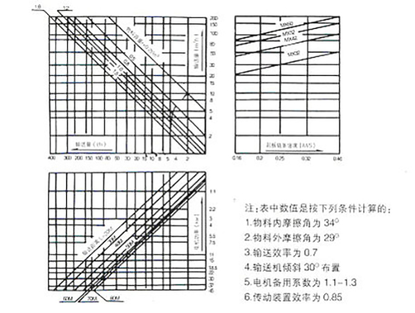注:表中數(shù)什得按下列條件計算的: 1 物料的內(nèi)摩擦角為304度 2 物料外的摩擦角為29度 3 輸送效率為0.7 4 輸送機傾斜30度布置 5 電機備用系數(shù)為1.1-1.3 6 傳動裝置效率為0.85